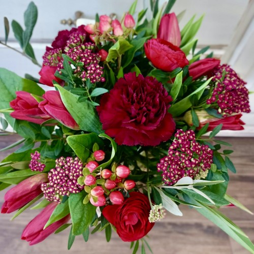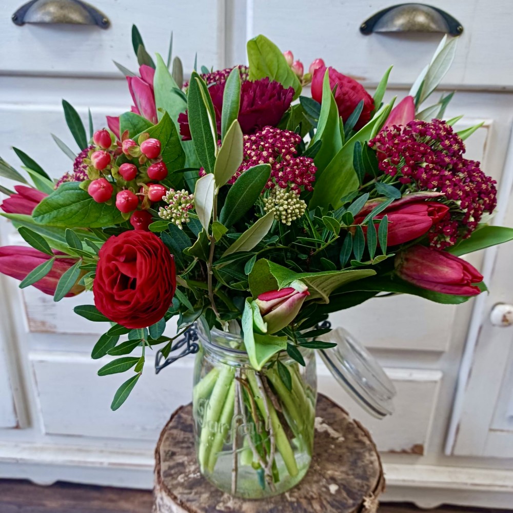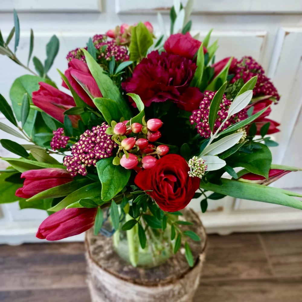 Bouquet rond rouge pour votre Valentin(e), avec des fleurs de saison et sans roses rouges pour respecter notre engagement éco-responsable !